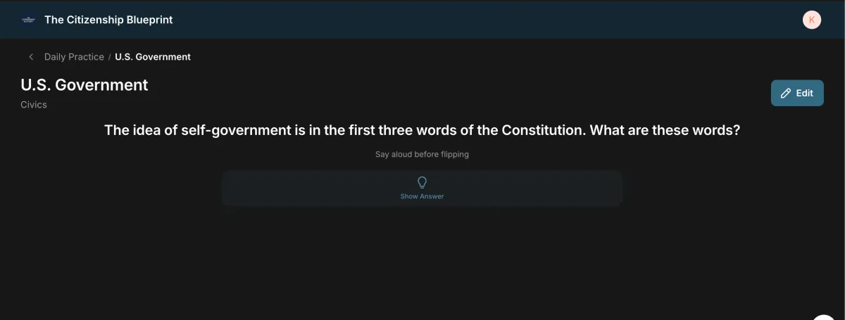 Active recall flashcards and localized civic questions train for real test scenarios.